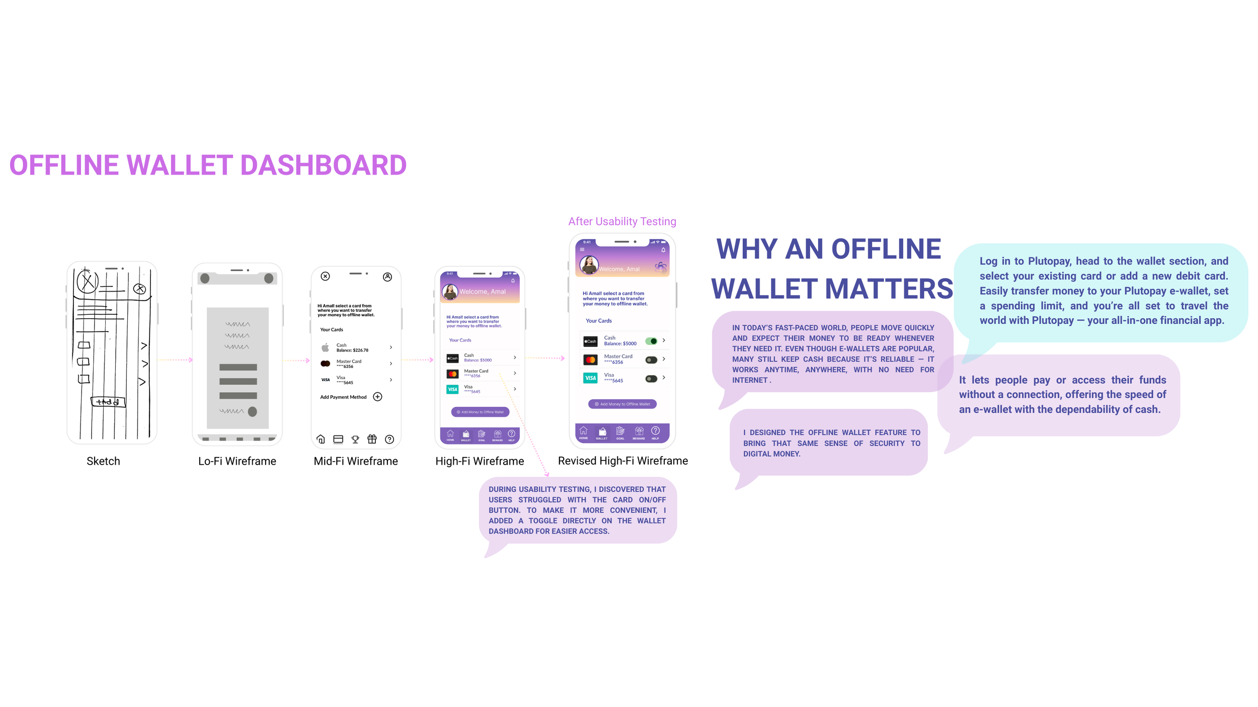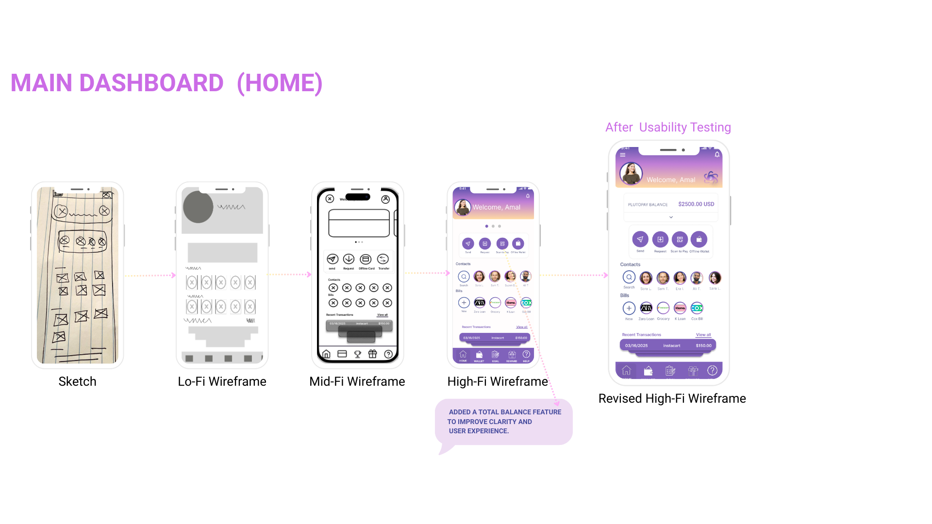 User feedback was also a key part of my process. It helped me make better design decisions and revealed new challenges I hadn’t considered. About two-thirds through the project, I realized one of the biggest issues with digital payments: people use multiple apps like Apple Pay, PayPal, and budgeting tools, which makes it hard to track spending in one place. That insight helped me think about how Plutopay could stand out—as a tool that brings those features together into one digital wallet focused on budgeting and financial clarity.
