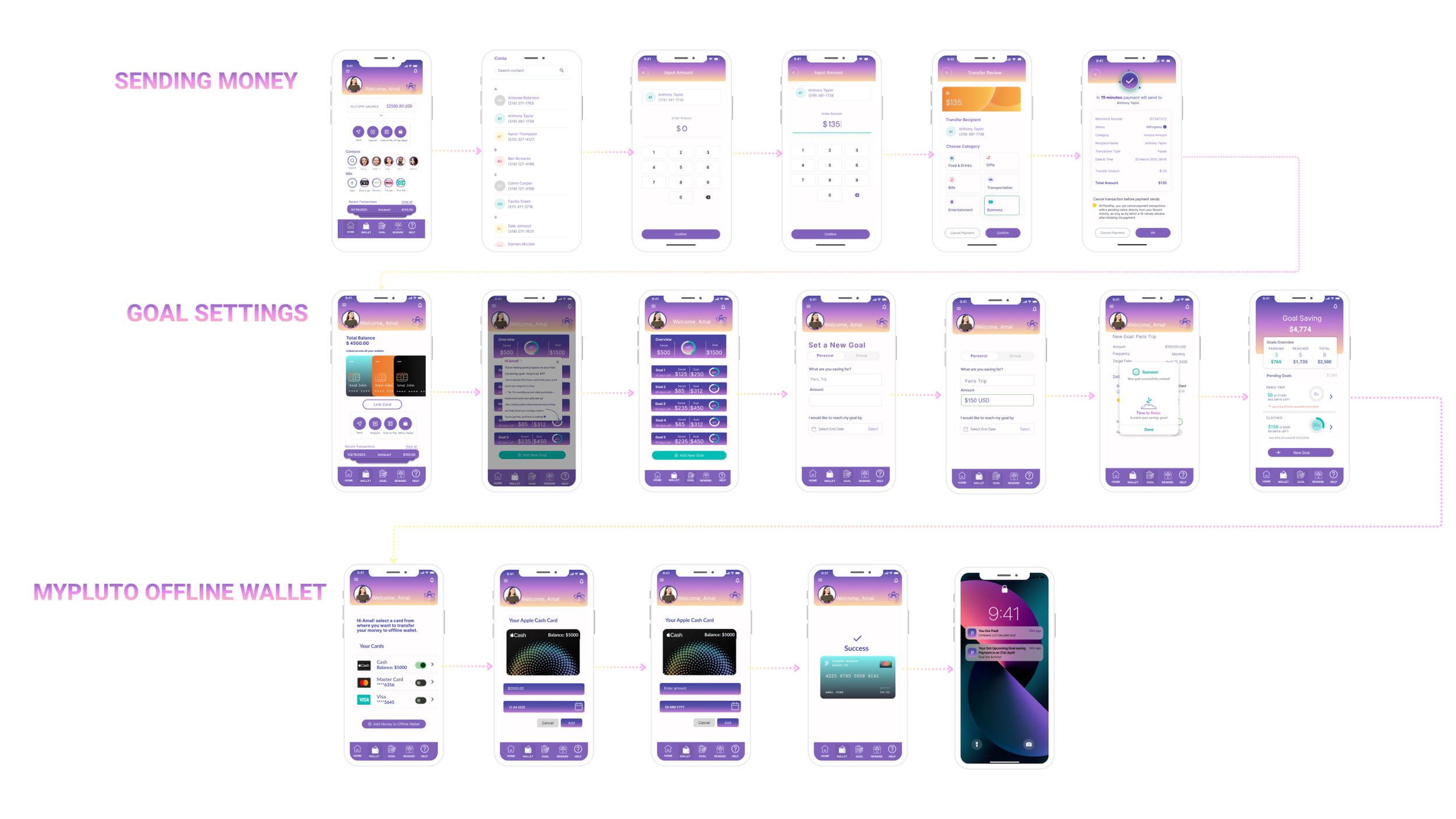 ACCOUNT CREATION, SEND MONEY, OFFLINE WALLET, and GOAL SETTING.