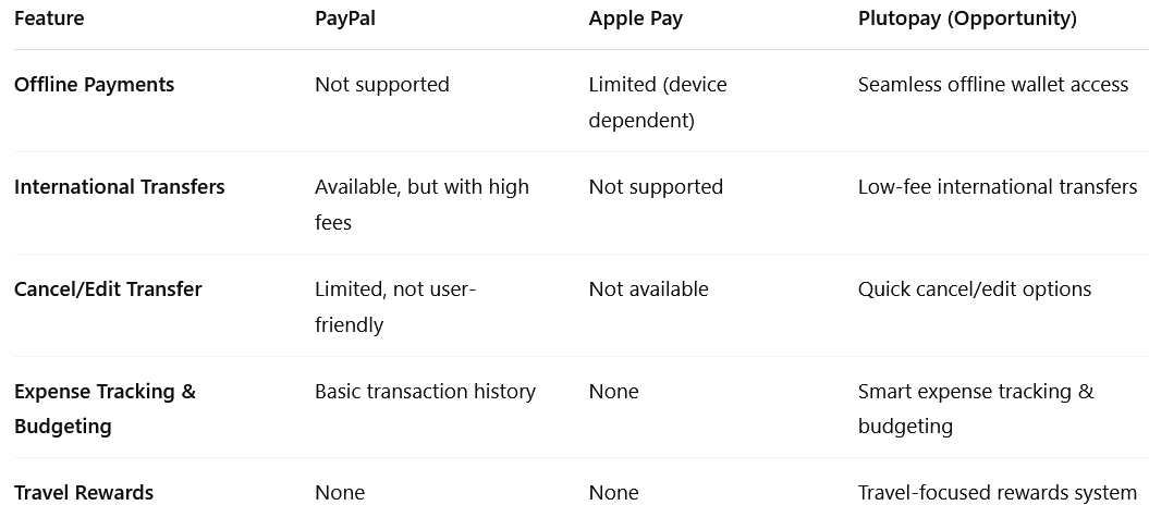 Both PayPal and Apple Pay lack offline access, flexible money transfer controls, and tailored features for travelers — clear areas where Plutopay can stand out.